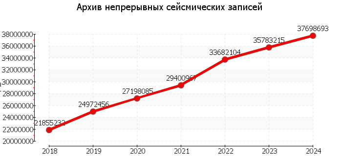 ОписаниеАрхив непрерывных сейсмических записей состоит из двух частей: архив реального времени и сводный архив. Архив реального времени непрерывных сейсмических записей формируется в реальном времени из сейсмических данных, поступающих с сейсмических станций и удаленных серверов сборапо каналам связи в режиме близком к реальному времени. Сводный архив формируется путем объединения данных, поступивших с удаленных сейсмостанций на съемных носителях, и данных, находящихся в архиве реального времени.Процедура обновления происходит ежегодно по мере поступления данных. Для хранения архива выбран формат хранения в виде суточных файлов по сейсмическим каналам станций в формате miniSEED. Поканальный архив сейсмических данных включает записи за период с 1996 по наст. вр. Доступ к серверу хранения архива осуществляется через веб-интерфейспо локальной сети.Интерфейс доступа позволяет получить информацию о наличии данных за текущую дату, построить суточную сейсмограмму по интересующему каналу в интересующей полосе частот, посмотреть системные сообщения, поступающие с регистраторов, и произвести выборку данных за интересующий интервал времени по маске каналов для последующего анализа.Географические границы