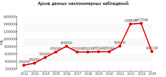 (2020(650000) и 2023(1398000+19046) года введены приблизительные значения объемов.) 2025 г. продолжение оптимизации хранения данных, объем архива уменьшен в несколько раз.